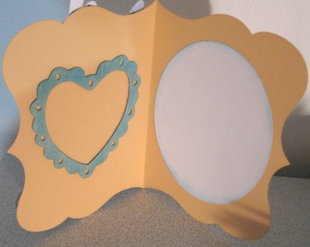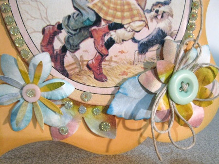Ho piegato la forma a metà, ho sfumato leggermente i bordi e ci ho attaccato l'immagine con il biadesivo spessorato dopo averla sfumato un po'. Le libellule sono ricavate da piccoli avanzi di carta patterned; le ho tagliate ed embossate con una fustella trovata in una rivista inglese comprata on line e ci ho applicato dei piccoli strass. Ho aggiunto degli strass anche sulle parti laterali dell'ovale.