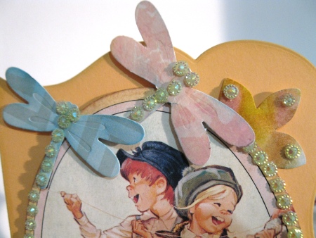 What a wonderful vintage image with those children's smiling, happy faces! I love the expression on the dog's face too - it's adorable! The flowers and dragonflies are gorgeous with all that bling too! Very pretty card!