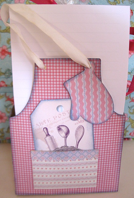 Questa scatolina a forma di grembiule da cucina ha due differenti funzioni: mi è servita per inserirci dentro un sacchetto di cioccolatini fondenti di alta qualità, ma una volta svuotata del dolce contenuto :D servirà alla destinataria per annotare "al volo" le ricette ascoltate in TV. Una specie di ricettario informale, insomma... :D