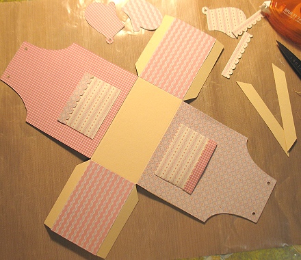 Per avere una scatola robusta ho tagliato le sagome due volte; dapprima su cartoncino pesante rimasto inutilizzato da un altro lavoro, e poi su piccoli pezzi di carta patterned, posizionati esattamente sulle parti della fustella che mi servivano. In questo modo ho recuperato i piccoli avanzi scrap, anche perchè altrimenti la carta non mi sarebbe bastata! :D