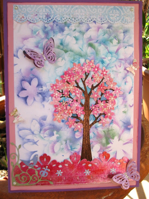 Congratulations on your GD at the Butterfly Challenge. Love that you've used the scrap inked papers to make the lovely soft background for this gorgeous tree. It makes me think of the pink dogwoods that bloom in our area in the springtime. Good idea with the texture embossing on the trunk too. Great butterfly punches, and I think your rosy border shows just very nicely! TFS & Have a great wkend. Hugs & TFS