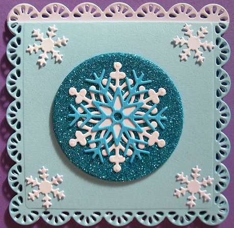 Il cerchio è di foam glitterato, e sopra ho incollato due fiocchi di neve, uno bianco e uno azzurro; altri piccoli fiocchetti li ho messi sugli angoli. (fustelle brand Wiler)