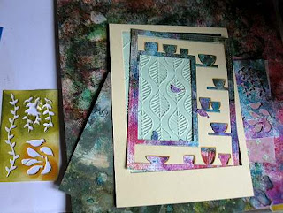 Per lo stencil sullo sfondo ho usato Izink 3D texture paste. Ho lasciato trasparire il gesso bianco qua e là. La rondine è tagliata con un punch per 5 volte, incollando a strati per dare dimensione (l'ultimo strato è un avanzo di carta patterned). Il cerchio sotto la rondine è un avanzo di una timbrata di un fiore Chocolate Baroque fatta su cartoncino kraft di riciclo embossato con polvere oro.